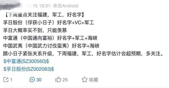 在投资者社区,记者注意到,11月16日上午,一名投资者将孚日股份的上涨归因于“好名字”:“孚日股份(俘获小日子)好名字+VC+军工”。