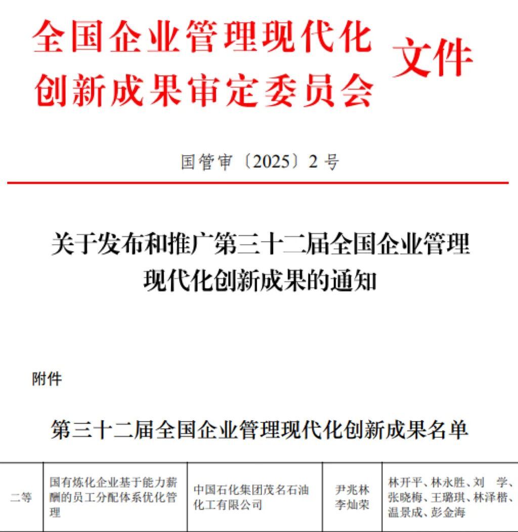 近日,中国企业联合会公布第三十二届全国企业管理现代化创新成果名单。茂名石化申报的“国有炼化企业基于能力薪酬的员工分配体系优化管理”从966项成果中脱颖而出,斩获全国成果二等奖。